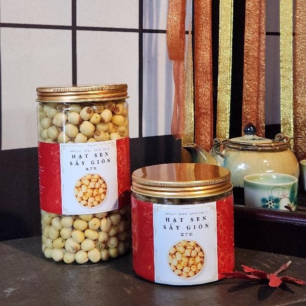 - Tem nhãn được in màu chuẩn, hình ảnh rõ ràng, không lem nhòe, đảm bảo tính thẩm mỹ và chuyên nghiệp cho sản phẩm hạt sen sấy.