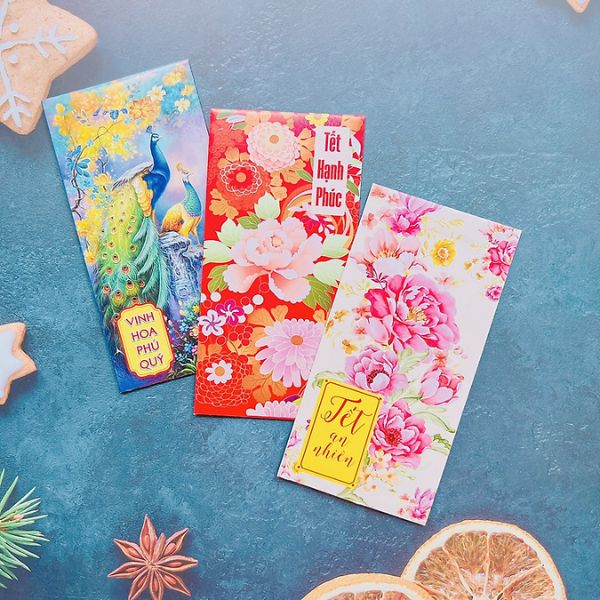 - Bao lì xì hoa đào: Gợi không khí Tết miền Bắc, mang nét tươi trẻ và khởi đầu mới.