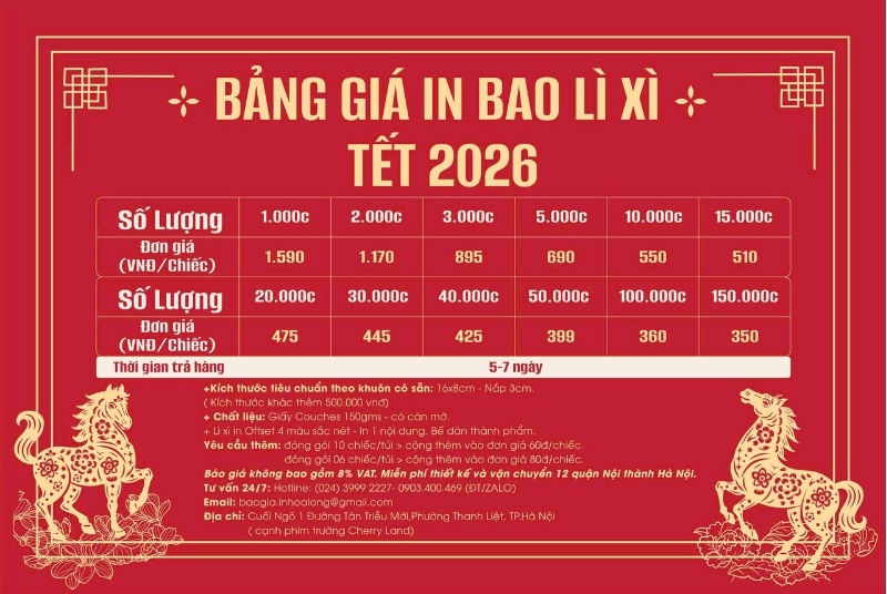 Đừng bỏ lỡ cơ hội sở hữu những chiếc bao lì xì độc đáo, ý nghĩa cho mùa Tết năm nay nhé! Hãy liên hệ ngay với In Hoa Long để được tư vấn chi tiết về dịch vụ in lì xì đỏ giá rẻ Hà Nội cho một năm mới vạn điều may.