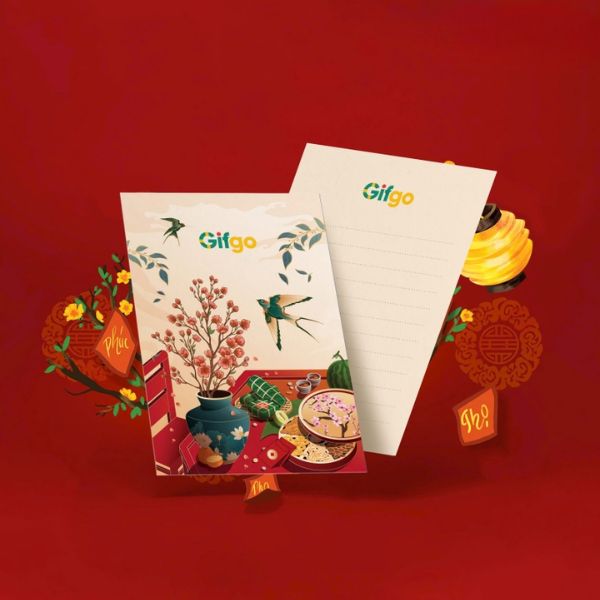 - Thiệp in hình hoa mai, hoa đào, mang hơi thở mùa xuân.
