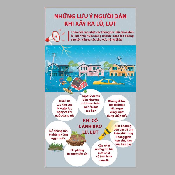 - Ưu tiên an toàn: Chủ động di chuyển đến các nơi cao ráo. Tránh xa các vùng nước chảy xiết, khu vực sạt lở.